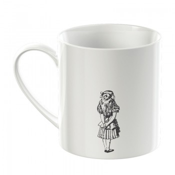 These mugs are decorated with a black and white illustrations of the fiery Queen of Hearts and the timid King of Hearts. On the Queen mug, the fearsome character points angrily, while her famous words ‘Off with their heads!’ line on the inside rim. On the second mug, the King looks on, while his phrase ‘Don’t be impertinent’ is featured inside.