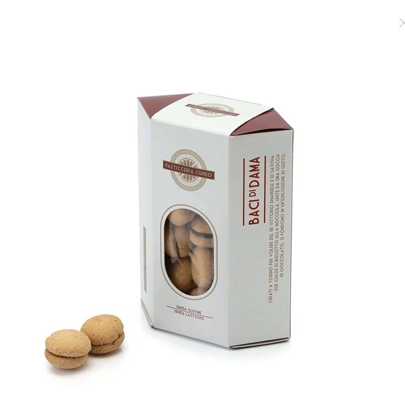 I Baci di Dama, senza glutine e senza lattosio, nascono dall'unione di due croccanti biscotti di pasta frolla che racchiudono una tenera farcitura al cioccolato fondente.