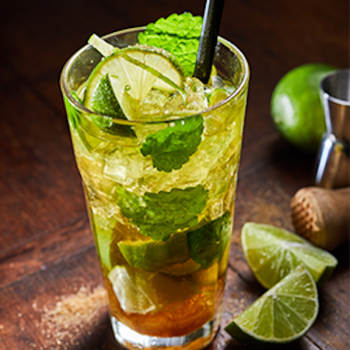 Riempi una brocca di cubetti di ghiaccio e versaci dentro il tè. Aggiungi 2 cucchiaini di zucchero di canna in un bicchiere capiente, un lime tagliato in quarti e 2 rametti di menta e schiacciali con un pestello.