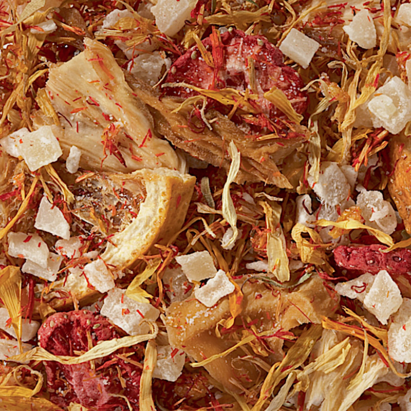 Ingredieti: cubetti di ananas, cubetti di mango , fiocchi di ananas, fiocchi di mango, spicchi di arancia, aroma, pezzetti di mandarancio liofilizzato, cartamo, fette di fragola liofilizzata, petali di calendula.