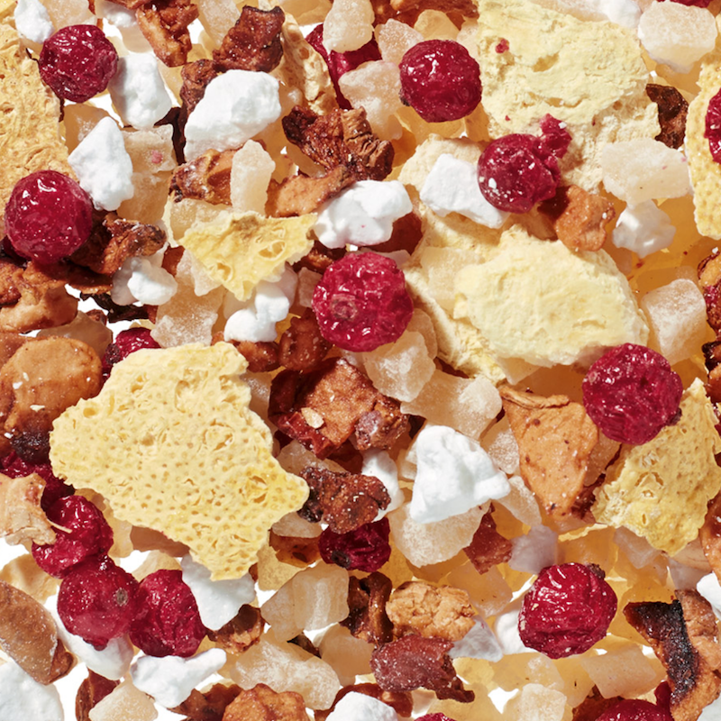 INGREDIENTI: cubetti di ananas, pezzetti di mela acidificati, granulato di limone liofilizzato, scorze di limone liofilizzate, ribes rosso liofilizzato, aroma.