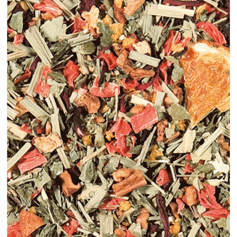 Gli infusi sono composti in prevalenza da karkadè e bacche di rosa canina a cui vengono aggiunti secondo la creatività del tea-blender pezzetti di frutta disidratata, scorze di agrumi, fiori, spezie e aromi. Sono privi di caffeina e adatti quindi a tutta la famiglia , diuretici e digestivi. Dissetanti in estate e corroboranti in inverno.Qui gli ingredienti sono, oltre al karkadè ,rosa canina, arancio scorza, mela in pezzi, papaya in pezzi, sambuco bacche, cannella in pezzi, mandorla in pezzi, zucchero candito in cristalli, dall'aroma dolce e agrumat