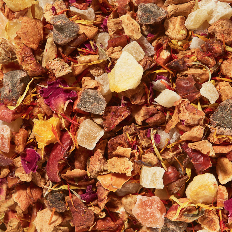 Gli infusi sono composti in prevalenza da karkadè e bacche di rosa canina a cui vengono aggiunti secondo la creatività del tea-blender pezzetti di frutta disidratata, scorze di agrumi, fiori, spezie e aromi. Sono privi di caffeina e adatti quindi a tutta la famiglia , diuretici e digestivi. Dissetanti in estate e corroboranti in inverno.Qui gli ingredienti sono, oltre al karkadè ,rosa canina, arancio scorza, mela in pezzi, papaya in pezzi, sambuco bacche, cannella in pezzi, mandorla in pezzi, zucchero candito in cristalli, dall'aroma dolce e agrumat