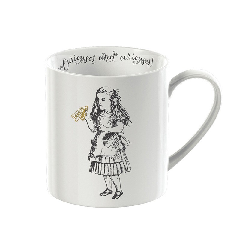 La riflessione di Alice, "Curioser and curioser", è stampata sul bordo interno della tazza in un carattere suggestivo e vorticoso. Girando la tazza da tè si scopre cosa è successo quando Alice ha deciso di seguire le istruzioni, con una versione in miniatura di Alice che guarda con meraviglia la sua ex persona più grande.