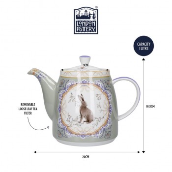 Questa elegante teiera a forma di campana è Progettata dal famoso ceramista e fondatore di London Pottery, David Birch. L'occhio è immediatamente attratto dall'illustrazione centrale. Realizzata in porcellana leggera ma resistente Con una generosa capacità di 1 litro, può contenere fino a quattro tazze da 250 ml. Il cestello in acciaio inossidabile brevettato e rimovibile blocca il coperchio in posizione per evitare che cada, mentre l'innovativo beccuccio antigoccia protegge mobili, tovaglie e vestiti dalle gocce.