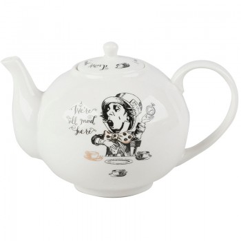 La superficie della teiera è decorata da illustrazioni in bianco e nero che raffigurano Alice al tea party del Cappellaio Matto.